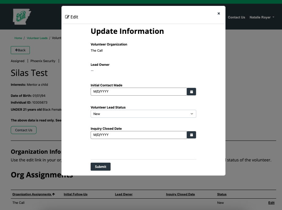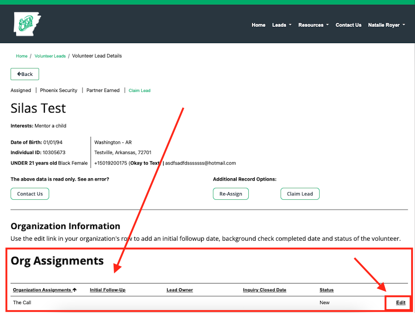 Instructions to update a volunteer lead